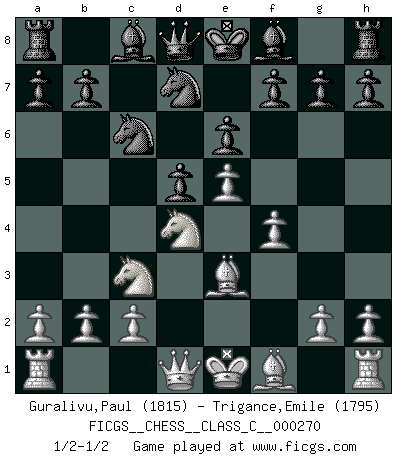 Last move : 1/2-1/2 2019 May 23 8:50:18 [Event "FICGS__CHESS__CLASS_C__000270"] [Site "FICGS"] [Date "2019.05.14"] [Round "1"] [White "Guralivu,Paul"] [Black "Trigance,Emile"] [Result "1/2-1/2"] [WhiteElo "1815"] [BlackElo "1795"] 1.e4 e6 2.d4 d5 3.Nc3 Nf6 4.e5 Nfd7 5.f4 c5 6.Nf3 Nc6 7.Be3 cxd4 8.Nxd4 1/2-1/2 French : Steinitz, Boleslavsky variation This chess game ended in a draw. Follow this game move after move (download)Not only will I predict his triumph over Botvinnik, but I'll go further and say that he'll probably be the greatest Chess player that ever lived. (John Collins) Das typische an einem Großmeister ist, daß er eine gewonnene Position schnell und schmerzlos gewinnt. (Irving Chernev) No es una movida, aún la mejor movida que tu debas buscar, sino un plan comprensible. (Eugene Znosko-Borovsky) La solitude du joueur d'Echecs à l'approche du mat est semblable à celle du condamné. (Francis Szpiner) If you lose the game you should win the analysis! (Proverb)