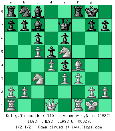 Last move : 1/2-1/2 2019 May 18 18:46:0 [Event "FICGS__CHESS__CLASS_C__000270"] [Site "FICGS"] [Date "2019.05.14"] [Round "1"] [White "Kuliy,Oleksandr"] [Black "Voudouris,Nick"] [Result "1/2-1/2"] [WhiteElo "1710"] [BlackElo "1837"] 1.d4 d5 2.c4 e6 3.Nc3 f5 4.Nf3 c6 5.Bf4 Bd6 6.e3 Nf6 7.Bd3 O-O 8.O-O Ne4 9.Bxe4 fxe4 10.Ne5 Qe7 11.c5 Bc7 12.f3 1/2-1/2 QGD : 3.Nc3 Kingside Castling by player Black (move 7) Kingside Castling by player White (move 8) This chess game ended in a draw. Follow this game move after move (download)It was clear to me that the vulnerable point of the American Grandmaster (Bobby Fischer) was in double-edged, hanging, irrational positions, where he often failed to find a win even in a won position. (Efim Geller) Ich trinke, ich rauche, ich spiele, ich liebe Frauen aber Fernschach ist ein Laster, das ich nicht habe. (Mikhail Nekhemyevich Tal) El Ajedrez es un regaderazo frío para la mente. (Sir John Simon) Les échecs c'est le défi de l'alpiniste, toujours plus haut, prêt à tout pour monter à l'assaut du Roi ennemi. Les échecs, c'est de la musique en mouvement, un ballet majestueux pour les yeux. C'est de la poésie composée par les fantômes du passé qui au même titre que Rimbaud ou Verlaine méritent notre admiration. Les échecs, c'est de la peinture ou le moindre mouvement modifie le tableau pour en faire un Picasso ou un Van Gogh. Les échecs, c'est tout et rien, c'est la vie et la mort. Jjulie33 sur le forum de France-Echecs. After growing wildly for years, the field of computing appears to be reaching its infancy. (John Pierce)
