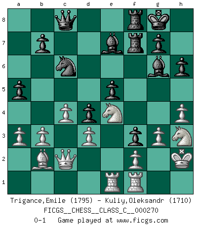 Last move : 0-1 2019 July 15 7:1:51 [Event "FICGS__CHESS__CLASS_C__000270"] [Site "FICGS"] [Date "2019.05.14"] [Round "1"] [White "Trigance,Emile"] [Black "Kuliy,Oleksandr"] [Result "0-1"] [WhiteElo "1795"] [BlackElo "1710"] 1.c4 e6 2.Nf3 d5 3.g3 Nf6 4.Bg2 Be7 5.O-O O-O 6.b3 d4 7.e3 c5 8.exd4 cxd4 9.Bb2 Nc6 10.Re1 Ne8 11.a3 a5 12.d3 f6 13.Nbd2 e5 14.h3 Nc7 15.Kh2 Be6 16.Ng1 Bf7 17.Rf1 Ne6 18.h4 Qb6 19.Nh3 Nc5 20.Qc2 Bg6 21.Be4 Nxe4 22.Nxe4 f5 23.Nd2 f4 24.Rae1 h6 25.Rg1 f3 26.Rgf1 Rf7 27.Ng1 Raf8 28.Ne4 Qd8 29.Nh3 Qc8 0-1 English : Neo-Catalan declined Kingside Castling by player White (move 5) Kingside Castling by player Black (move 5) Player Black won this chess game. Follow this game move after move (download)There is no remorse like the remorse of Chess. (H. G. Wells) Das Schachspiel ist ein See, in welchem eine Mücke baden und ein Elefant ertrinken kann. (Emanuel Lasker) Solo los afeminados hacen el Enroque. (Rob Sillars) Les échecs sont un jeu par leur forme, un art par leur essence et une science par sa difficulté d'acquisition. Ils peuvent vous procurer autant de plaisir qu'un bon livre ou une belle musique, mais vous n'aurez une réelle joie que si vous arrivez à bien jouer. (Tigran Petrosian) When you have everything, sometimes it feels like nothing. (Horatio Caine, C.S.I. Miami)