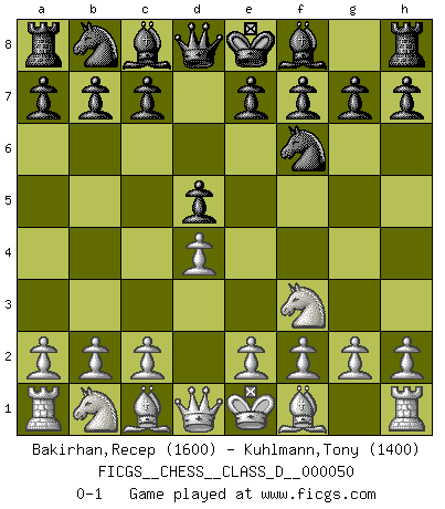 Last move : 0-1 2007 July 23 18:23:35 [Event "FICGS__CHESS__CLASS_D__000050"] [Site "FICGS"] [Date "2007.06.12"] [Round "1"] [White "Bakirhan,Recep"] [Black "Kuhlmann,Tony"] [Result "0-1"] [WhiteElo "1600"] [BlackElo "1400"] 1.Nf3 d5 2.d4 Nf6 0-1 This chess game has been lost on time (started : 2007.06.12 1:10:41) Reti Opening Player Black won this chess game. Follow this game move after move (download)The Pin is mightier than the sword. (Fred Reinfeld) Wer wird heute Abend ihr Gegner sein? -- Heute Abend spiele ich gegen die schwarzen Steine. (Akiba Rubinstein) El Ajedrez se juega con la mente... ¡no con las manos!. (Renaud y Kahn) Les réformistes prétendent que les progrès de la théorie conduiront à la disparition des échecs, et qu'il faut, pour leur rendre vie, en remanier les règles. En réalité, qu'exprime cette affirmation? Le mépris de l'intuition, de l'imagination et de tous les autres éléments qui font des échecs un art. (Alexander Alekhine) A journey of a thousand sites begins with a single click. (Author unknown)