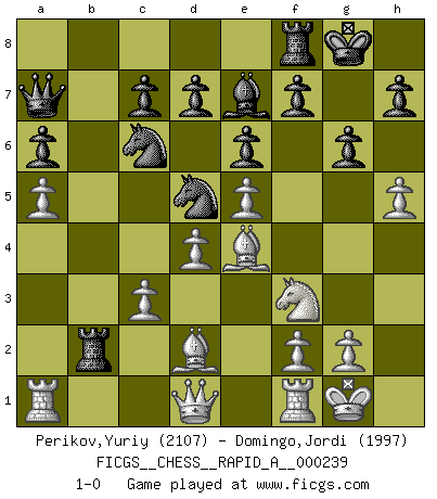 Last move : 1-0 2019 June 29 18:14:14 [Event "FICGS__CHESS__RAPID_A__000239"] [Site "FICGS"] [Date "2019.05.17"] [Round "1"] [White "Perikov,Yuriy"] [Black "Domingo,Jordi"] [Result "1-0"] [WhiteElo "2107"] [BlackElo "1997"] 1.d4 b5 2.e4 Bb7 3.Nd2 a6 4.a4 b4 5.Ngf3 Nf6 6.e5 Nd5 7.Bd3 e6 8.Nb3 Be7 9.Na5 Qc8 10.O-O Nc6 11.Nxb7 Qxb7 12.Bd2 Qa7 13.c4 bxc3 14.bxc3 Rb8 15.a5 g6 16.h4 O-O 17.h5 Rb2 18.Be4 1-0 Polish defense Kingside Castling by player White (move 10) Kingside Castling by player Black (move 16) Player White won this chess game. Follow this game move after move (download)Chess is a terrible game. If you have no center, your opponent has a freer position. If you do have a center, then you really have something to worry about ! (Siegbert Tarrasch) Es hat in meinem Leben Zeiten gegeben, da ich sehr nahe daran war zu glauben, daß ich auch nicht eine einzige Schachpartie verlieren könnte. (José Raúl Capablanca) Los libros de Ajedrez deben de usarse igual como usamos los anteojos: para mejorar la vista, aunque algunos jugadores los quieren usar como si ellos les otorgaran la vision. (José Raúl Capablanca) Ce qui est bien, c'est d'avoir tout un tas de pièces en prise : l'adversaire ne peut en prendre qu'une à la fois. Cité par Thierry Audin. Computers have lots of memory but no imagination. (Anonymous)