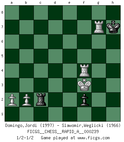 Last move : 1/2-1/2 2019 July 5 21:44:20 [Event "FICGS__CHESS__RAPID_A__000239"] [Site "FICGS"] [Date "2019.05.17"] [Round "1"] [White "Domingo,Jordi"] [Black "Slawomir,Weglicki"] [Result "1/2-1/2"] [WhiteElo "1997"] [BlackElo "1966"] 1.e4 c5 2.Nf3 e6 3.d4 cxd4 4.Nxd4 Nf6 5.Nc3 d6 6.g4 h6 7.h4 a6 8.Rg1 d5 9.exd5 Nxd5 10.Nxd5 Qxd5 11.Be3 e5 12.Nf5 Qxd1+ 13.Rxd1 h5 14.Bh3 hxg4 15.Bxg4 Nc6 16.h5 Nb4 17.Rd2 g6 18.hxg6 fxg6 19.Nd6+ Bxd6 20.Rxd6 Nxc2+ 21.Kd2 Nxe3 22.Kxe3 Bf5 23.Bxf5 gxf5 24.Rg7 Rc8 25.Rxb7 Rh3+ 26.Kd2 e4 27.Rxa6 Rd3+ 28.Ke2 Rc2+ 29.Kf1 Rd1+ 30.Kg2 Rd7 31.Rb5 Re7 32.Ra8+ Kf7 33.Rxf5+ Kg6 34.Rf4 e3 35.Rg8+ Kh7 36.Rg3 Rg7 37.Kf3 exf2 38.Rxg7+ 1/2-1/2 Sicilian : Anderssen variation 10 pieces endgame at move 33 : White KRRPPP , Black KRRP WHITE : King + 2 Rooks 3 Pawns BLACK : King + 2 Rooks 1 Pawn 9 pieces endgame at move 37 : White KRRPP , Black KRRP WHITE : King + 2 Rooks 2 Pawns BLACK : King + 2 Rooks 1 Pawn 8 pieces endgame at move 38 : White KRRPP , Black KRP WHITE : King + 2 Rooks 2 Pawns BLACK : King + 1 Rook 1 Pawn This chess game ended in a draw. Follow this game move after move (download)The laws of Chess do not permit a free choice: you have to move whether you like it or not. (Emanuel Lasker) Moralische Siege zählen nicht. (Savielly Grigorievitsch Tartakower) Solo el jugador con la iniciativa tiene el derecho a atacar. (Wilhelm Steinitz) Les sacrifices démontrent seulement que quelqu'un a gaffé. (Savielly Tartacover) The real voyage of discovery consists not in seeking new lands but in seeing with new eyes. (Marcel Proust)