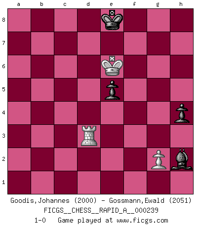 Last move : 1-0 2019 June 17 9:11:26 [Event "FICGS__CHESS__RAPID_A__000239"] [Site "FICGS"] [Date "2019.05.17"] [Round "1"] [White "Goodis,Johannes"] [Black "Gossmann,Ewald"] [Result "1-0"] [WhiteElo "2000"] [BlackElo "2051"] 1.d4 Nf6 2.Bg5 Ne4 3.h4 c5 4.d5 Qb6 5.Nd2 h6 6.Bf4 Qxb2 7.Nxe4 Qb4+ 8.c3 Qxe4 9.e3 g6 10.Ne2 Bg7 11.Rc1 Qc4 12.Nd4 Qxa2 13.Nb5 Na6 14.Ra1 Qb2 15.Ra3 d6 16.e4 c4 17.Bxc4 Bg4 18.Qxg4 Qb1+ 19.Kd2 Qxh1 20.Nxd6+ exd6 21.Bxd6 Nc7 22.Rxa7 Bxc3+ 23.Kc2 Rd8 24.Bxc7 Qe1 25.Qe2 Rc8 26.d6 O-O 27.Qxe1 Bxe1 28.Rxb7 Bxf2 29.h5 gxh5 30.d7 Rxc7 31.Rxc7 Rd8 32.Be2 h4 33.Bg4 Kf8 34.Kd3 f6 35.Rc6 Ke7 36.e5 fxe5 37.Rxh6 Rxd7+ 38.Bxd7 Kxd7 39.Ra6 Ke7 40.Ke4 Bg3 41.Kf5 Bf4 42.Re6+ Kd7 43.Kf6 Bh2 44.Ra6 Bf4 45.Ra3 Bh2 46.Rd3+ Ke8 47.Ke6 1-0 Trompowsky attack (Ruth, Opovcensky Opening) Kingside Castling by player Black (move 26) 10 pieces endgame at move 37 : White KRBPP , Black KRBPP WHITE : King + 1 Rook 1 Bishop 2 Pawns BLACK : King + 1 Rook 1 Bishop 2 Pawns 9 pieces endgame at move 37 : White KRBP , Black KRBPP WHITE : King + 1 Rook 1 Bishop 1 Pawn BLACK : King + 1 Rook 1 Bishop 2 Pawns 8 pieces endgame at move 38 : White KRBP , Black KBPP WHITE : King + 1 Rook 1 Bishop 1 Pawn BLACK : King + 1 Bishop 2 Pawns 7 pieces endgame at move 38 : White KRP , Black KBPP WHITE : King + 1 Rook 1 Pawn BLACK : King + 1 Bishop 2 Pawns Player White won this chess game. Follow this game move after move (download)Morphy was probably the greatest genius of them all. (Bobby Fischer) Schach verlangt totale Konzentration. (Robert James Fischer) En el Ajedrez, tal como es jugado por los Maestros, practicamente la suerte es eliminada. (Emanuel Lasker) On croit qu'il y a plus de mauvais joueurs que de bons joueurs, c'est faux : Il y a autant de joueurs qui gagnent que de joueurs qui perdent. (Philippe Geluck) There is no instance of a country having benefited from prolonged warfare. (Sun Tzu)