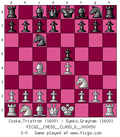 Last move : 1-0 2007 July 24 6:30:35 [Event "FICGS__CHESS__CLASS_D__000050"] [Site "FICGS"] [Date "2007.06.12"] [Round "1"] [White "Cooke,Tristrom"] [Black "Symko,Grayham"] [Result "1-0"] [WhiteElo "1600"] [BlackElo "1600"] 1.e4 e5 2.Nf3 Nc6 3.Bc4 1-0 This chess game has been lost on time (started : 2007.06.12 1:10:41) King's pawn game Player White won this chess game. Follow this game move after move (download)Discovered check is the dive bomber of the Chessboard. (Reuben Fine) Es war undenkbar für die Behörden, dass ein sowjetischer Großmeister auf diese Art und Weise [Fischer-Taimanov 6:0] verliert, ohne dass es eine politischer Erklärung dafür gäbe. (Mark Taimanov) Cualquier cambio de material en una posición debe venir por medio de un mate, una captura o promoción de Peón. (Purdy) Les Echecs ont trois composantes : le temps, l'espace et le matériel en dernier. (Mikhail Tal) Convictions are more dangerous enemies of truth than lies. (Friedrich Nietzsche)