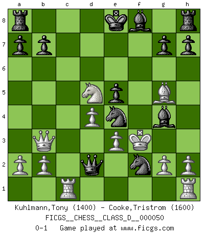 Last move : 0-1 2007 July 21 17:44:42 [Event "FICGS__CHESS__CLASS_D__000050"] [Site "FICGS"] [Date "2007.06.12"] [Round "1"] [White "Kuhlmann,Tony"] [Black "Cooke,Tristrom"] [Result "0-1"] [WhiteElo "1400"] [BlackElo "1600"] 1.d4 d5 2.c4 c6 3.cxd5 cxd5 4.Nc3 Nf6 5.Nf3 Nc6 6.Bg5 Ne4 7.e3 Qa5 8.Qc2 e5 9.Bd3 Nb4 10.Qb3 Nxd3+ 11.Ke2 Ndxf2 12.Nxe5 f6 13.Nxd5 fxe5 14.Rac1 Qd2+ 15.Kf3 Bg4+ 0-1 QGD Slav defense : Exchange variation Player Black won this chess game. Follow this game move after move (download)The Pawns are the soul of the game. (Francois Andre Danican Philidor) Ich rechne überhaupt nicht voraus. Ich gewinne auch so. (Robert James Fischer) Las ideas audaces son como las piezas del Ajedrez que avanzan hacia adelante. Ellas pueden ser vencidas, pero también pueden iniciar una partida victoriosa. (Goethe) Le système Elo représente seulement une moyenne. Il est simplement un indicateur de votre stabilité. (Anatoli Karpov) The quality of decision is like the well-timed swoop of a falcon which enables it to strike and destroy its victim. (Sun Tzu)