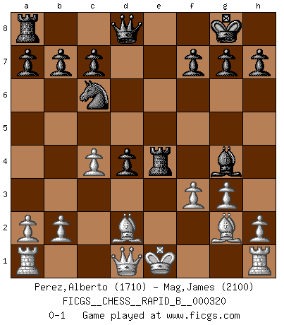 Last move : 0-1 2019 July 11 15:30:17 [Event "FICGS__CHESS__RAPID_B__000320"] [Site "FICGS"] [Date "2019.05.18"] [Round "1"] [White "Perez,Alberto"] [Black "Mag,James"] [Result "0-1"] [WhiteElo "1710"] [BlackElo "2100"] 1.c4 Nf6 2.Nc3 e5 3.d3 Nc6 4.g3 Bb4 5.Bd2 O-O 6.Bg2 Bxc3 7.Bxc3 d5 8.Nf3 d4 9.Bd2 e4 10.Ng5 exd3 11.exd3 Re8+ 12.Ne4 Bg4 13.f3 Nxe4 14.dxe4 Rxe4+ 0-1 This chess game has been lost on time (started : 2019.05.18 17:19:25) English Opening Kingside Castling by player Black (move 5) Player Black won this chess game. Follow this game move after move (download)If your opponent cannot do anything active, then don't rush the position; instead you should let him sit there, suffer, and beg you for a draw. (Jeremy Silman) Ich bin der einzige Schachspieler, der sich während der Vorbereitungen zum Turnier verletzt hat. (Woody Allen) El Ajedrez es el juego mas altamente simbólico, pero las agresiones estan por lo tanto aún mas francamente representadas en la partida. Tal vez comenzo como un juego de guerra; Algo como la representación de una batalla en miniatura entre las fuerzas de dos reinos. (Karl Meninger) La guerre est enfant de la passion, la passion est enfant du narcissisme et le narcissisme est l'enfant. (...) Une autre partie ? (Thibault de Vassal) When a man with money meets a man with experience, the man with experience leaves with money and the man with money leaves with experience. (Anonymous)