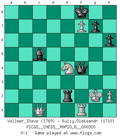 Last move : 0-1 2019 September 6 10:14:6 [Event "FICGS__CHESS__RAPID_B__000320"] [Site "FICGS"] [Date "2019.05.18"] [Round "1"] [White "Vollmer,Steve"] [Black "Kuliy,Oleksandr"] [Result "0-1"] [WhiteElo "1769"] [BlackElo "1710"] 1.e4 e6 2.d4 d5 3.Nc3 Nf6 4.e5 Nfd7 5.Be3 c5 6.f4 Nc6 7.Nf3 a6 8.Bd3 b5 9.Qd2 b4 10.Nd1 Qb6 11.c3 a5 12.O-O Be7 13.Nf2 c4 14.Be2 O-O 15.Ng5 h6 16.Ngh3 Rd8 17.g4 a4 18.Rab1 a3 19.f5 exf5 20.gxf5 Ndxe5 21.dxe5 d4 22.cxd4 Bxf5 23.Rbd1 axb2 24.Qxb2 c3 25.Qc1 c2 26.Rd2 b3 27.axb3 Ba3 28.Qa1 Nxe5 29.Nf4 Qxb3 30.dxe5 Qxe3 31.Rxd8+ Rxd8 32.Kg2 Bc5 33.Qc1 Rd2 34.e6 Qxf4 35.exf7+ Kf8 36.Qe1 c1Q 37.Qxc1 Be4+ 38.Nxe4 Rxe2+ 0-1 French : Steinitz variation Kingside Castling by player White (move 12) Kingside Castling by player Black (move 14) Promotion Queen by player Black (move 36) Player Black won this chess game. Follow this game move after move (download)A man without frontiers. He didn't divide the East and the West, he brought them together in their admiration for him. (Ljubomir Ljubojevic, about Bobby Fischer's death) Warum muß ich gegen diesen IDIOTEN verlieren? (Aaron Nimzowitsch) El Ajedrez te enseña a controlarl la excitación inicial que sientes cuando vez algo que parece bueno y te enseña a pensar objetivamente cuando te encuentras en problemas. (Stanley Kubrick) Les échecs, c'est l'imagination. (David Bronstein) All politicians must be presumed guilty until they are proven innocent. (Dinesh De Silva)
