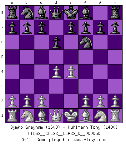 Last move : 0-1 2007 July 22 12:17:29 [Event "FICGS__CHESS__CLASS_D__000050"] [Site "FICGS"] [Date "2007.06.12"] [Round "1"] [White "Symko,Grayham"] [Black "Kuhlmann,Tony"] [Result "0-1"] [WhiteElo "1600"] [BlackElo "1400"] 1.e4 d6 2.d4 Nf6 0-1 This chess game has been lost on time (started : 2007.06.12 1:10:41) King's pawn Opening Player Black won this chess game. Follow this game move after move (download)A bad plan is better than none at all. (Frank Marshall) Wie bekannt hörte Morphy 1859 auf, Schach zu spielen. Seine Enttäuschung galt nicht so sehr dem Schach, wie den Schachspielern. (Robert James Fischer) Aquel que teme a un Peón de Reina aislado, debería de retirarse del Ajedrez. (Siegbert Tarrasch) Vouloir jouer aux échecs contre soi-même est aussi paradoxal que vouloir marcher sur son ombre. (Stefan Zweig) SEO proverb : Make your website optimized for human beings, not for search engines.
