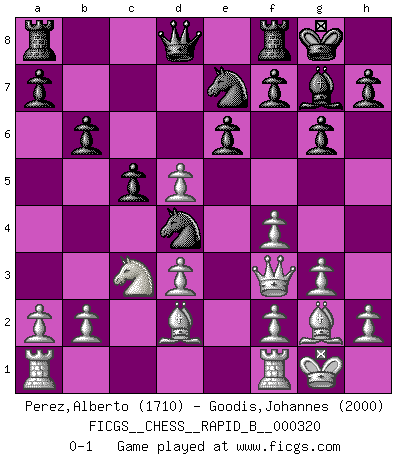 Last move : 0-1 2019 July 9 0:0:20 [Event "FICGS__CHESS__RAPID_B__000320"] [Site "FICGS"] [Date "2019.05.18"] [Round "1"] [White "Perez,Alberto"] [Black "Goodis,Johannes"] [Result "0-1"] [WhiteElo "1710"] [BlackElo "2000"] 1.c4 c5 2.Nc3 g6 3.d3 Bg7 4.Bd2 b6 5.g3 Bb7 6.Nf3 Bxf3 7.exf3 e6 8.Bg2 Nc6 9.f4 Nge7 10.O-O O-O 11.Qf3 d5 12.cxd5 Nd4 0-1 This chess game has been lost on time (started : 2019.05.18 17:19:25) English : Symmetrical variation Kingside Castling by player White (move 10) Kingside Castling by player Black (move 10) Player Black won this chess game. Follow this game move after move (download)No one ever won a game by resigning. (Unknown) Ich bin Weltmeister und muß mit niemandem irgend etwas diskutieren. (Viswanathan Anand) Por la belleza de sus partidas, la claridad de su juego y lo brillante de sus ideas, Fischer se creó el mismo como un artista de la misma estatura como Brahms, Rembrandt y Shakespeare. (David Levy) Les Echecs ne sont pas pour les âmes timides. Ils requièrent un homme entier, qui ne s'arrête pas aveuglément à ce qui a été déjà établi, mais qui tente individuellement de sonder les profondeurs du jeu. (W. Steinitz) If you ain't just a little scared when you enter a casino, you are either very rich or you haven't studied the games enough. (Pappy)