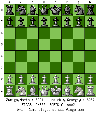 Last move : 0-1 2019 June 18 0:0:18 [Event "FICGS__CHESS__RAPID_C__000211"] [Site "FICGS"] [Date "2019.05.18"] [Round "1"] [White "Zuniga,Mario"] [Black "Uralskiy,Georgiy"] [Result "0-1"] [WhiteElo "1500"] [BlackElo "1608"] 0-1 This chess game has been lost on time (started : 2019.05.18 17:52:20) Player Black won this chess game. Follow this game move after move (download)Chess is a beautiful mistress. (Bent Larsen) Ein unbeabsichtigtes Patt ist der Gipfel der Dummheit. (Anonymous) Una buena memoria, concentración, imaginación y una fuerte voluntad, se requiere para llegar a ser un buen jugador. (Bobby Fischer) Les ravages du H expliquent la différence de niveau entre Tal et Thal [Abergel]. Wisdom doesn't necessarily come with age. Sometimes age just shows up all by itself. (Tom Wilson)