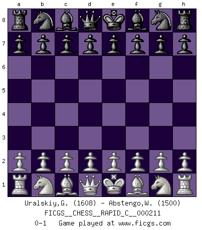 Last move : 0-1 2019 June 18 0:0:18 [Event "FICGS__CHESS__RAPID_C__000211"] [Site "FICGS"] [Date "2019.05.18"] [Round "1"] [White "Uralskiy,Georgiy"] [Black "Abstengo,William"] [Result "0-1"] [WhiteElo "1608"] [BlackElo "1500"] 0-1 This chess game has been lost on time (started : 2019.05.18 17:52:20) Player Black won this chess game. Follow this game move after move (download)The blunders are all there on the board, waiting to be made. (Savielly Tartakover) Ein Teil des Fehlers ist immer korrekt. (Savielly Grigorievitsch Tartakower) El Ajedrez moderno está demasiado preocupado con cosas como la estructura de Peones. Olvidenlo, el Jaque Mate termina la partida. (Nigel Short) Seul un grand joueur sait à quel point il joue faiblement. (Xavier Tartacover) Never risk one's whole fortune unless supported by one's entire army. (Niccolo Machiavelli)
