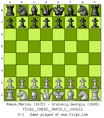 Last move : 0-1 2019 June 18 0:0:18 [Event "FICGS__CHESS__RAPID_C__000211"] [Site "FICGS"] [Date "2019.05.18"] [Round "1"] [White "Ramos,Marcos"] [Black "Uralskiy,Georgiy"] [Result "0-1"] [WhiteElo "1672"] [BlackElo "1608"] 0-1 This chess game has been lost on time (started : 2019.05.18 17:52:20) Player Black won this chess game. Follow this game move after move (download)One doesn't have to play well, it's enough to play better than your opponent. (Siegbert Tarrasch) Das Schach ist nichts für kleine Geister, es beansprucht einen vollen Mann, der sich nicht sklavisch an das Überlieferte hält, sondern selbständig die Tiefen des Spiels zu ergründen sucht. (Wilhelm Steinitz) Cualquier cambio de material en una posición debe venir por medio de un mate, una captura o promoción de Peón. (Purdy) Lorsque vous vous retrouvez devant une position atroce, ne tendez pas un ultime piège dérisoire avec l'intention d'abandonner si l'adversaire le déjoue ! Faites-vous plutôt un devoir de résister comme si votre vie en dépendait. Jouez le coup qui vous déplairait au centuple si vous étiez dans la peau de votre tortionnaire ! There's always a bigger fish. (Qui-Gon Jinn in Star Wars ep.1)