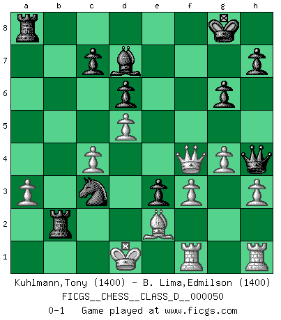 Last move : 0-1 2007 July 22 13:57:7 [Event "FICGS__CHESS__CLASS_D__000050"] [Site "FICGS"] [Date "2007.06.12"] [Round "1"] [White "Kuhlmann,Tony"] [Black "B. Lima,Edmilson"] [Result "0-1"] [WhiteElo "1400"] [BlackElo "1400"] 1.d4 Nf6 2.c4 g6 3.Nc3 Bg7 4.e4 d6 5.Nf3 O-O 6.Be2 e5 7.d5 a5 8.h3 Na6 9.Be3 b6 10.Qd2 Nc5 11.Bh6 Ncxe4 12.Nxe4 Nxe4 13.Qe3 Bxh6 14.Qxh6 f5 15.Qe3 f4 16.Qb3 Nc5 17.Qa3 e4 18.Nd4 Qg5 19.g4 Bd7 20.f3 Qh4+ 21.Kd2 Qf2 22.Nc2 b5 23.Raf1 e3+ 24.Kd1 b4 25.Nxb4 axb4 26.Qxb4 Qh4 27.a3 Rfb8 28.Qc3 Na4 29.Qd4 Rxb2 30.Qxf4 Nc3+ 0-1 King's Indian : Petrosian system, Stein variation Kingside Castling by player Black (move 5) Player Black won this chess game. Follow this game move after move (download)When your house is on fire, you can't be bothered with the neighbors. Or, as we say in Chess, if your King is under attack you don't worry about losing a Pawn on the Queen's side. (Gary Kasparov) Fischer ist das größte Genie, das je vom Schachhimmel heruntergestiegen ist. (Mikhail Nekhemyevich Tal) De eso se trata el Ajedrez. Un día le das una lección a tu oponente y al día siguiente el te da una a tí. (Bobby Fischer) Je crois qu'il existe des manières très spécifiques de jouer efficacement contre une machine. Evidemment, nous n'avons aucune chance en technique pure, parce que l'ordinateur calcule de manière parfaite. Mais lorsque nous faisons appel à notre cerveau, en utilisant l'intuition et la compréhension, alors nous restons beaucoup plus forts. (Anatoli Karpov) If only people were all showed a certain minimum level of niceness; if only people didn't retract verbal draw offers (without draw box ticked) on ficgs; if only people didn't kill; if only people didn't run concentration / extermination camps, if only people didn't drop nuclear bombs on Hiroshima and Nagasaki, and so on - it would be a much more beautiful world. But sadly, things are not so... (Normajean Yates)