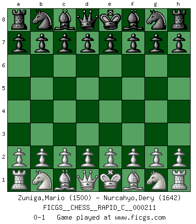 Last move : 0-1 2019 June 18 0:0:18 [Event "FICGS__CHESS__RAPID_C__000211"] [Site "FICGS"] [Date "2019.05.18"] [Round "1"] [White "Zuniga,Mario"] [Black "Nurcahyo,Dery"] [Result "0-1"] [WhiteElo "1500"] [BlackElo "1642"] 0-1 This chess game has been lost on time (started : 2019.05.18 17:52:20) Player Black won this chess game. Follow this game move after move (download)It is no time to be playing Chess when the house is on fire. (Italian Proverb) Karpov ist ein Museumsstück. (Garry Kasparov) Peones: ellos son el alma de esta partida, solos forman el ataque y la defensa. (Philidor) Ce n'est pas pour s'amuser qu'il joue aux échecs : il célèbre un culte. (Vladimir Nabokov) If you ain't just a little scared when you enter a casino, you are either very rich or you haven't studied the games enough. (Pappy)