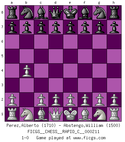 Last move : 1-0 2019 July 2 23:52:23 [Event "FICGS__CHESS__RAPID_C__000211"] [Site "FICGS"] [Date "2019.05.18"] [Round "1"] [White "Perez,Alberto"] [Black "Abstengo,William"] [Result "1-0"] [WhiteElo "1710"] [BlackElo "1500"] 1.b4 1-0 This chess game has been lost on time (started : 2019.05.18 17:52:20) Polish (Sokolsky) opening Player White won this chess game. Follow this game move after move (download)Bobby is the finest Chess player this country ever produced. His memory for the moves, his brilliance in dreaming up combinations, and his fierce determination to win are uncanny. (John Collins) Die westlichen Werte sind eine Sprache, welche die Putin-Administration nicht versteht. (Garry Kasparov) Tu puedes aprender mucho mas de una partida que pierdas que de una partida ganada. Tendras que perder cientos de partidas antes de llegar a ser un buen jugador. (Jose Raul Capablanca) La conception d'un plan est le processus par lequel un joueur exploite les avantages de sa position tout en s'efforçant d'en réduire au minimum les inconvénients. Afin de garantir le succès, un plan doit toujours se fonder sur un diagnostic objectif des particularités d'une position. La conception d'un plan est d'autant plus difficile que la position est équilibrée, et grandement facilitée lorsqu'il n'existe qu'un seul plan susceptible de répondre aux exigences de la position. (Harry Golombek) Computers make it easier to do a lot of things, but most of the things they make it easier to do don't need to be done. (Andy Rooney)