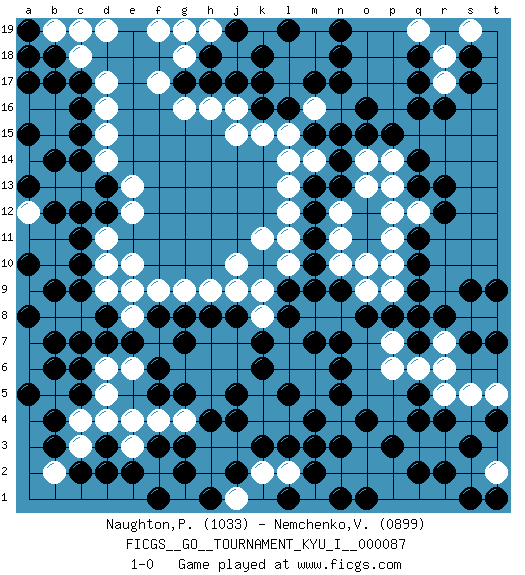 Last move : 1-0 2019 August 18 8:48:24 [Event "FICGS__GO__TOURNAMENT_KYU_I__000087"] [Site "FICGS"] [Date "2019.05.21"] [Round "1"] [Black "Naughton,Patrick"] [White "Nemchenko,Valery"] [Result "1-0"] [Rating 1 "1033"] [Rating 2 "0899"] 1.q16 d4 2.q4 d16 3.q10 o10 4.f3 e4 5.j4 f4 6.g3 g4 7.h4 h5 8.c10 e10 9.d7 d5 10.d13 e13 11.d12 e12 12.c15 d15 13.c16 d14 14.c14 d17 15.c17 c18 16.g17 d19 17.k16 j15 18.n17 k15 19.l16 l15 20.j5 h6 21.n3 j6 22.r4 o9 23.r16 p14 24.r13 p12 25.k10 d11 26.c11 d9 27.k7 j7 28.k6 k8 29.j8 j9 30.h8 h9 31.g8 g9 32.f8 f9 33.l8 k9 34.l9 l10 35.m10 l11 36.m11 k11 37.n9 n10 38.m12 l12 39.m13 l13 40.m15 m14 41.n14 l14 42.d8 e8 43.e7 e9 44.f6 d6 45.c9 c8 46.c7 d10 47.g5 g6 48.f5 e6 49.c6 b8 50.c5 c4 51.d2 e3 52.e2 b5 53.b7 a7 54.b9 a9 55.a8 a6 56.a10 n15 57.n13 m16 58.m17 l17 59.k17 j16 60.j17 h16 61.h17 g16 62.b3 h7 63.g7 f17 64.o15 n16 65.o16 o14 66.m15 n8 67.m9 m8 68.o8 l7 69.m7 o13 70.p8 p9 71.q9 p10 72.n7 n11 73.q11 p11 74.q13 p13 75.q14 n12 76.p15 g18 77.h18 f19 78.b18 b19 79.b17 a18 80.a17 a19 81.c19 b19 82.b4 c3 83.c2 b2 84.b6 l18 85.k18 h19 86.j19 g19 87.pass j10 88.a5 m18 89.n18 m19 90.n19 m16 91.n15 l6 92.l5 m6 93.n6 m5 94.m4 h3 95.d3 f2 96.g2 q8 97.r8 k19 98.l19 c13 99.c12 b13 100.b14 a14 101.b12 a12 102.a15 a18 103.a13 h2 104.f1 j3 105.k3 k2 106.l3 l2 107.m2 m1 108.h1 j1 109.j2 n2 110.m3 o2 111.q2 p2 112.p3 o3 113.o4 q1 114.r2 r1 115.l1 s2 116.s3 t3 117.t4 t2 118.s1 p1 119.n1 t5 120.t1 s5 121.s7 r5 122.q5 q6 123.q7 p6 124.n5 q12 125.r12 t2 126.o1 r6 127.a19 c19 128.a18 s8 129.s9 t8 130.t7 r7 131.t9 p7 132.q8 r17 133.s18 r18 134.s17 s19 135.q18 q19 136.q17 1-0 Here are the names of the openings (joseki) played in the four corners : Corner d4 : d4 f3 Hoshi (Hwajeom, Seongjeom, Xingwei`) 4-4 Point. The star or hoshi (4-4) point, emphasizing influence at the potential expense of territory. Ikken Kakari (Hankan Keolch'im, Yi Gua`jiao~, 1-Space Low Approach). Black 2 is the standard approach move to the 4-4. Corner d16 : d16 d13 Hoshi (Hwajeom, Seongjeom, Xingwei`) 4-4 Point. The star or hoshi (4-4) point, emphasizing influence at the potential expense of territory. Niken Takagakari (Dukan Nop'dakeolch'im, E`r Gaojia, 2-Space High Approach). Black 2 is a light approach move. Rarely played in even games, Black 2 is typically employed in handicap games. White continues with 6-4 or 3-10. In Korean Sunjang Baduk White has a stone on 8-4. Player Black won this Go (weiqi, baduk) game. Follow this game move after move (download)Avoid the plate connection. (Anonymous) Fame, I have already. Now I need the money. (an elderly Steinitz)