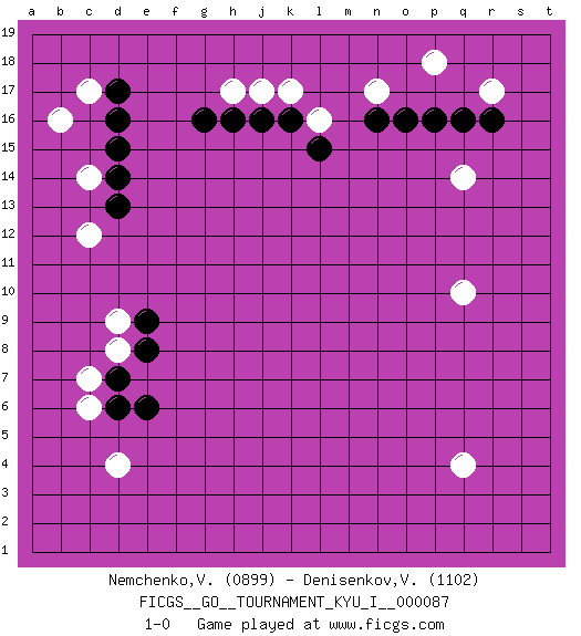 Last move : 1-0 2019 July 17 19:0:50 [Event "FICGS__GO__TOURNAMENT_KYU_I__000087"] [Site "FICGS"] [Date "2019.05.21"] [Round "1"] [Black "Nemchenko,Valery"] [White "Denisenkov,Valentin"] [Result "1-0"] [Rating 1 "0899"] [Rating 2 "1102"] 1.q16 d4 2.d16 q4 3.e6 c14 4.d15 b16 5.d14 c17 6.d17 c12 7.d13 k17 8.j16 n17 9.k16 l16 10.l15 j17 11.h16 h17 12.g16 c6 13.d6 c7 14.d7 d8 15.e8 d9 16.e9 q14 17.p16 p18 18.o16 r17 19.r16 q10 20.n16 1-0 This go game has been lost on time (started : 2019.05.21 0:8:54) Here are the names of the openings (joseki) played in the four corners : Corner d4 : d4 e6 Hoshi (Hwajeom, Seongjeom, Xingwei`) 4-4 Point. The star or hoshi (4-4) point, emphasizing influence at the potential expense of territory. Corner d16 : d16 c14 Hoshi (Hwajeom, Seongjeom, Xingwei`) 4-4 Point. The star or hoshi (4-4) point, emphasizing influence at the potential expense of territory. Ikken Kakari (Hankan Keolch'im, Yi Gua`jiao~, 1-Space Low Approach). White 2 is the standard approach move to the 4-4. Corner q16 : q16 n17 Hoshi (Hwajeom, Seongjeom, Xingwei`) 4-4 Point. The star or hoshi (4-4) point, emphasizing influence at the potential expense of territory. Niken Kakari (Dukan Keolch'im, E`r Gua`jiao~, 2-Space Low Approach). Black typically answers by 7-3 or 3-5 (which is not joseki). Player Black won this Go (weiqi, baduk) game. Follow this game move after move (download)The strong player plays straight, the weak diagonally. (Anonymous) Ah, the Socrating method. The best way we have of teaching everything-apart from juggling chainsaws. (Gregory House, House M.D.)