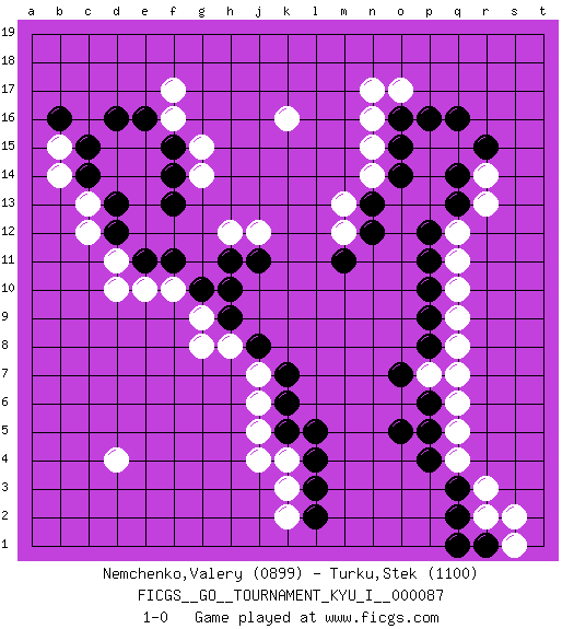 Last move : 1-0 2019 August 31 5:25:19 [Event "FICGS__GO__TOURNAMENT_KYU_I__000087"] [Site "FICGS"] [Date "2019.05.21"] [Round "1"] [Black "Nemchenko,Valery"] [White "Turku,Stek"] [Result "1-0"] [Rating 1 "0899"] [Rating 2 "1100"] 1.q16 d4 2.d16 q4 3.o5 q6 4.p5 q5 5.p6 p7 6.o7 q8 7.p8 q7 8.p9 q10 9.p10 q11 10.p11 q12 11.p12 k16 12.q13 o17 13.o16 n16 14.p16 f17 15.e16 f16 16.f15 g15 17.f14 d10 18.e11 e10 19.f11 d11 20.d12 f10 21.g10 g9 22.h10 k4 23.k5 j5 24.l5 j6 25.k6 j7 26.k7 n15 27.o15 n14 28.o14 g14 29.f13 h12 30.h9 h8 31.j8 g8 32.l4 k3 33.l3 k2 34.l2 j4 35.p4 c12 36.d13 c13 37.c14 b14 38.c15 b15 39.b16 r13 40.q14 r14 41.r15 q9 42.q3 r3 43.q2 r2 44.r1 s1 45.q1 s2 46.n13 m13 47.n12 m12 48.m11 n17 49.h11 j12 50.j11 1-0 This go game has been lost on time (started : 2019.05.21 0:8:54) Here are the names of the openings (joseki) played in the four corners : Corner q4 : q4 o5 Hoshi (Hwajeom, Seongjeom, Xingwei`) 4-4 Point. The star or hoshi (4-4) point, emphasizing influence at the potential expense of territory. Corner q16 : q16 q11 Hoshi (Hwajeom, Seongjeom, Xingwei`) 4-4 Point. The star or hoshi (4-4) point, emphasizing influence at the potential expense of territory. Corner d16 : d16 f17 Hoshi (Hwajeom, Seongjeom, Xingwei`) 4-4 Point. The star or hoshi (4-4) point, emphasizing influence at the potential expense of territory. Ikken Kakari (Hankan Keolch'im, Yi Gua`jiao~, 1-Space Low Approach). White 2 is the standard approach move to the 4-4. Player Black won this Go (weiqi, baduk) game. Follow this game move after move (download)Don't disturb symmetry. (Anonymous) Now be brave and don't look back. Don't look back. (Shmi Skywalker in Star Wars ep.1)