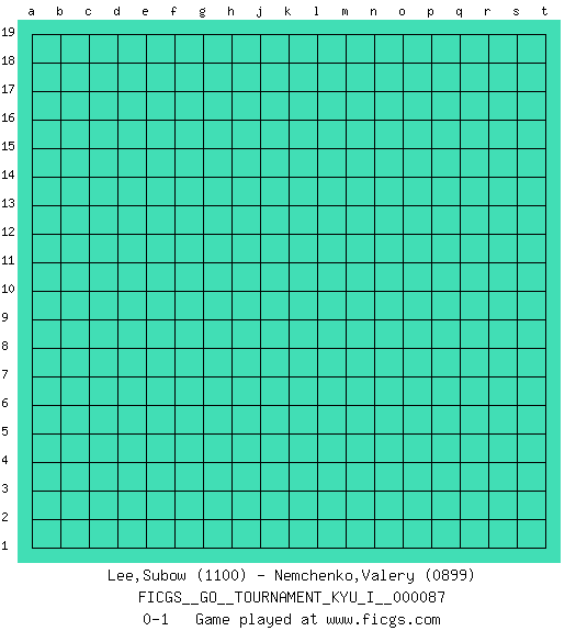 Last move : 0-1 2019 June 20 10:45:20 [Event "FICGS__GO__TOURNAMENT_KYU_I__000087"] [Site "FICGS"] [Date "2019.05.21"] [Round "1"] [Black "Lee,Subow"] [White "Nemchenko,Valery"] [Result "0-1"] [Rating 1 "1100"] [Rating 2 "0899"] 0-1 This go game has been lost on time (started : 2019.05.21 0:8:54) Here are the names of the openings (joseki) played in the four corners : Player White won this Go (weiqi, baduk) game. Follow this game move after move (download)Proverbs do not apply to White. (Tero Sand) You have to believe in yourself. (Sun Tzu)