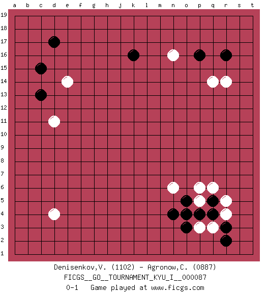 Last move : 0-1 2019 July 23 8:7:40 [Event "FICGS__GO__TOURNAMENT_KYU_I__000087"] [Site "FICGS"] [Date "2019.05.21"] [Round "1"] [Black "Denisenkov,Valentin"] [White "Agronow,Cosmo"] [Result "0-1"] [Rating 1 "1102"] [Rating 2 "0887"] 1.r16 d4 2.d17 r5 3.c15 q14 4.p16 n16 5.k16 e14 6.c13 d11 7.r3 p3 8.q4 p5 9.q5 q6 10.p4 o4 11.o3 q3 12.o5 p6 13.n4 r4 14.o4 n6 15.r2 r14 0-1 This go game has been lost on time (started : 2019.05.21 0:8:54) Here are the names of the openings (joseki) played in the four corners : Corner q16 : r16 q14 Komoku (Somok, Xiao~mu`) 3-4 Point. The komoku (3-4) point is the traditional corner enclosure move.. Corner q4 : r5 r3 Mokuhazushi (Waemok, Wai`mu`) 5-3 Point. The mokuhazushi (5-3) point was popular in the Edo period in Japan (1600 - 1867). It emphasizes influence; territorially, it is inferior to the 3-4 point. San-san. Black goes for profit at the expense of influence. A ladder helps Black when playing 2. Player White won this Go (weiqi, baduk) game. Follow this game move after move (download)The carpenter's square becomes ko. (Anonymous) Whatever you do, don't be bored. This is absolutely the most exciting time we could have possibly hoped to be alive. And things are just starting. (From movie Waking life)