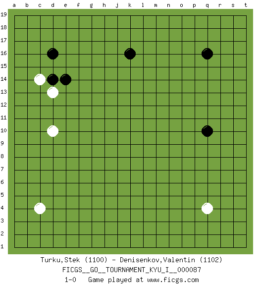 Last move : 1-0 2019 July 22 3:0:9 [Event "FICGS__GO__TOURNAMENT_KYU_I__000087"] [Site "FICGS"] [Date "2019.05.21"] [Round "1"] [Black "Turku,Stek"] [White "Denisenkov,Valentin"] [Result "1-0"] [Rating 1 "1100"] [Rating 2 "1102"] 1.q16 c4 2.d16 q4 3.k16 c14 4.q10 d10 5.d14 d13 6.e14 1-0 This go game has been lost on time (started : 2019.05.21 0:8:54) Here are the names of the openings (joseki) played in the four corners : Corner d16 : d16 c14 Hoshi (Hwajeom, Seongjeom, Xingwei`) 4-4 Point. The star or hoshi (4-4) point, emphasizing influence at the potential expense of territory. Ikken Kakari (Hankan Keolch'im, Yi Gua`jiao~, 1-Space Low Approach). White 2 is the standard approach move to the 4-4. Player Black won this Go (weiqi, baduk) game. Follow this game move after move (download)Attach to the strongest stone in a pincer. (Anonymous) O divine art of subtlety and secrecy! Through you we learn to be invisible, through you inaudible and hence we can hold the enemy's fate in our hands. (Sun Tzu)