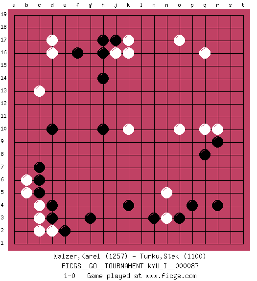 Last move : 1-0 2019 July 17 20:36:53 [Event "FICGS__GO__TOURNAMENT_KYU_I__000087"] [Site "FICGS"] [Date "2019.05.21"] [Round "1"] [Black "Walzer,Karel"] [White "Turku,Stek"] [Result "1-0"] [Rating 1 "1257"] [Rating 2 "1100"] 1.d4 q16 2.r4 d16 3.p4 k16 4.k4 q10 5.d10 k10 6.f16 c13 7.j17 d17 8.h14 j16 9.h16 k17 10.h17 o17 11.h10 c3 12.d3 c4 13.c5 b5 14.c6 b6 15.c7 d2 16.e2 c2 17.g3 n3 18.q8 o10 19.r9 r10 20.m3 n5 21.o3 1-0 Here are the names of the openings (joseki) played in the four corners : Corner d16 : d16 f16 Hoshi (Hwajeom, Seongjeom, Xingwei`) 4-4 Point. The star or hoshi (4-4) point, emphasizing influence at the potential expense of territory. Ikken Takagakari (Hankan Nop'dakeolch'im, Yi Gaojia, 1-Space High Approach). White typically responds at 6-4 or 3-10. White 4-10 is played when White finds play on the right side advantageous. White 4-8 or 3-8 may be played when White has support at top. Corner d4 : d4 c3 Hoshi (Hwajeom, Seongjeom, Xingwei`) 4-4 Point. The star or hoshi (4-4) point, emphasizing influence at the potential expense of territory. Player Black won this Go (weiqi, baduk) game. Follow this game move after move (download)Be a little patient. Keshi works ! (Anonymous) Coffee just isn't my cup of tea. (Unknown)
