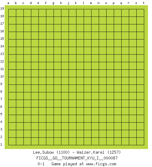 Last move : 0-1 2019 June 20 10:45:20 [Event "FICGS__GO__TOURNAMENT_KYU_I__000087"] [Site "FICGS"] [Date "2019.05.21"] [Round "1"] [Black "Lee,Subow"] [White "Walzer,Karel"] [Result "0-1"] [Rating 1 "1100"] [Rating 2 "1257"] 0-1 This go game has been lost on time (started : 2019.05.21 0:8:54) Here are the names of the openings (joseki) played in the four corners : Player White won this Go (weiqi, baduk) game. Follow this game move after move (download)Stop on second, extend on third. (Anonymous) Memory... is the diary that we all carry with us. (Oscar Wilde, The Importance of Being Earnest)