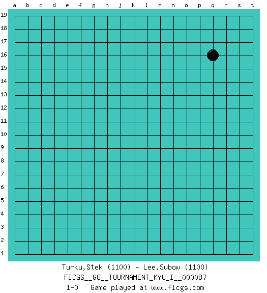 Last move : 1-0 2019 June 20 10:45:20 [Event "FICGS__GO__TOURNAMENT_KYU_I__000087"] [Site "FICGS"] [Date "2019.05.21"] [Round "1"] [Black "Turku,Stek"] [White "Lee,Subow"] [Result "1-0"] [Rating 1 "1100"] [Rating 2 "1100"] 1.q16 1-0 This go game has been lost on time (started : 2019.05.21 0:8:54) Here are the names of the openings (joseki) played in the four corners : Player Black won this Go (weiqi, baduk) game. Follow this game move after move (download)You have to like to win, and to learn to recognize the errors that gave you the victory. (Pierre Audouard) If we don't succeed, we run the risk of failure. (George W. Bush)