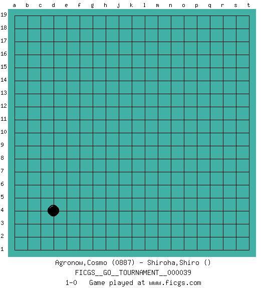 Last move : 1-0 2019 June 22 17:31:22 [Event "FICGS__GO__TOURNAMENT__000039"] [Site "FICGS"] [Date "2019.05.23"] [Round "1"] [Black "Agronow,Cosmo"] [White "Shiroha,Shiro"] [Result "1-0"] [Rating 1 "0887"] 1.d4 1-0 This go game has been lost on time (started : 2019.05.23 14:41:26) Here are the names of the openings (joseki) played in the four corners : Corner d4 : d4 1-0 Hoshi (Hwajeom, Seongjeom, Xingwei`) 4-4 Point. The star or hoshi (4-4) point, emphasizing influence at the potential expense of territory. Player Black won this Go (weiqi, baduk) game. Follow this game move after move (download)Error is one of the sources of transformation. (Pierre Audouard) Nobody is always a winner, and anybody who says he is, is either a liar or doesn't play poker. (Amarillo Slim)