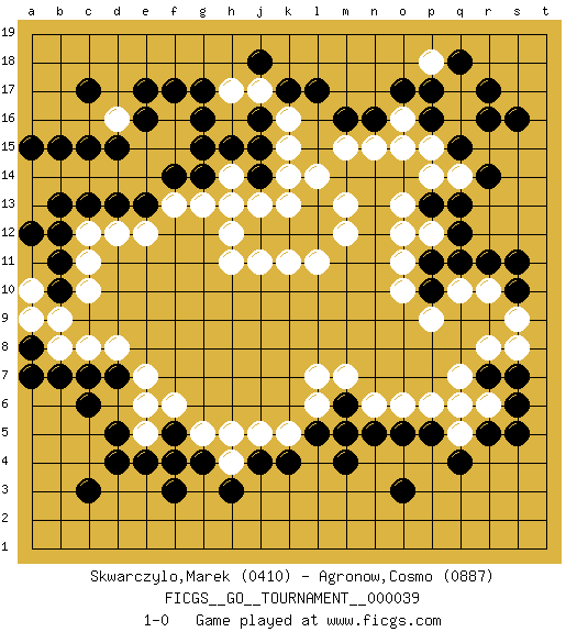 Last move : 1-0 2019 October 18 12:49:28 [Event "FICGS__GO__TOURNAMENT__000039"] [Site "FICGS"] [Date "2019.05.23"] [Round "1"] [Black "Skwarczylo,Marek"] [White "Agronow,Cosmo"] [Result "1-0"] [Rating 1 "0410"] [Rating 2 "0887"] 1.q4 d16 2.d4 q16 3.f17 f16 4.g16 r6 5.o3 p6 6.c6 e7 7.e17 k16 8.c17 c11 9.k4 k5 10.f3 f4 11.j4 j5 12.m4 m5 13.e4 e5 14.r14 p14 15.q12 p12 16.q11 p9 17.s16 r10 18.h15 h14 19.g14 g13 20.j14 h13 21.g4 g5 22.f5 f6 23.f4 h4 24.k12 k11 25.h3 h5 26.d5 e6 27.j16 k13 28.l12 l11 29.r17 q17 30.j12 j13 31.e16 f15 32.f14 e15 33.d15 e14 34.e13 d14 35.c15 e12 36.d13 c14 37.c13 b14 38.b13 c8 39.l13 k14 40.j15 k15 41.g15 f13 42.k17 j17 43.j18 h17 44.g17 h11 45.l17 l14 46.r5 q5 47.s5 j11 48.p5 q6 49.s6 m12 50.n16 m13 51.q15 p15 52.p16 o16 53.p17 p18 54.o17 o15 55.q18 n15 56.m16 m15 57.c3 a13 58.a12 a14 59.b15 h12 60.r11 q10 61.n5 n6 62.o5 o6 63.l5 l6 64.m6 m7 65.m5 l7 66.p11 o11 67.p10 o10 68.p13 o12 69.q13 o13 70.s7 r8 71.s10 s9 72.s11 s8 73.r7 q7 74.d7 d8 75.b10 c10 76.b11 c12 77.b12 q14 78.r16 b9 79.c7 d12 80.b7 a9 81.a8 b8 82.a7 a10 83.a15 1-0 Here are the names of the openings (joseki) played in the four corners : Corner d16 : d16 f17 Hoshi (Hwajeom, Seongjeom, Xingwei`) 4-4 Point. The star or hoshi (4-4) point, emphasizing influence at the potential expense of territory. Ikken Kakari (Hankan Keolch'im, Yi Gua`jiao~, 1-Space Low Approach). Black 2 is the standard approach move to the 4-4. Corner q4 : q4 r6 Hoshi (Hwajeom, Seongjeom, Xingwei`) 4-4 Point. The star or hoshi (4-4) point, emphasizing influence at the potential expense of territory. Ikken Kakari (Hankan Keolch'im, Yi Gua`jiao~, 1-Space Low Approach). White 2 is the standard approach move to the 4-4. Corner q16 : q16 r14 Hoshi (Hwajeom, Seongjeom, Xingwei`) 4-4 Point. The star or hoshi (4-4) point, emphasizing influence at the potential expense of territory. Ikken Kakari (Hankan Keolch'im, Yi Gua`jiao~, 1-Space Low Approach). Black 2 is the standard approach move to the 4-4. Player Black won this Go (weiqi, baduk) game. Follow this game move after move (download)The weak player fears ko, the strong player seeks it. (Bill Taylor) It's not the will to win, but the will to prepare to win that makes the difference. (Bear Bryant)