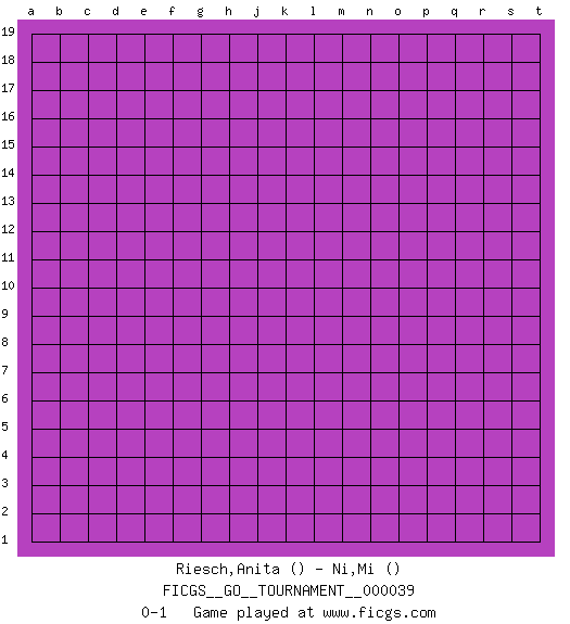 Last move : 0-1 2019 June 22 17:31:22 [Event "FICGS__GO__TOURNAMENT__000039"] [Site "FICGS"] [Date "2019.05.23"] [Round "1"] [Black "Riesch,Anita"] [White "Ni,Mi"] [Result "0-1"] 0-1 This go game has been lost on time (started : 2019.05.23 14:41:26) Here are the names of the openings (joseki) played in the four corners : Player White won this Go (weiqi, baduk) game. Follow this game move after move (download)Always remember, keep the balance. [between territory and influence] (Figaro) You must do what you feel is right... of course. (Obi-Wan Kenobi in Star Wars ep.4)