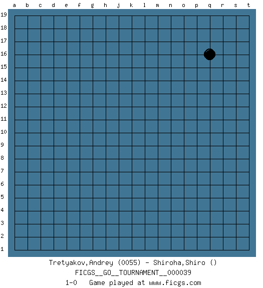Last move : 1-0 2019 June 23 8:2:56 [Event "FICGS__GO__TOURNAMENT__000039"] [Site "FICGS"] [Date "2019.05.23"] [Round "1"] [Black "Tretyakov,Andrey"] [White "Shiroha,Shiro"] [Result "1-0"] [Rating 1 "0055"] 1.q16 1-0 This go game has been lost on time (started : 2019.05.23 14:41:26) Here are the names of the openings (joseki) played in the four corners : Player Black won this Go (weiqi, baduk) game. Follow this game move after move (download)Balance is not what players strike for, and if it does arise, it is in spite of them. (Pierre Audouard) The real danger is not that computers will begin to think like men, but that men will begin to think like computers. (Sydney J. Harris)