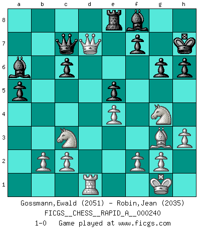 Last move : 1-0 2019 June 27 22:30:34 [Event "FICGS__CHESS__RAPID_A__000240"] [Site "FICGS"] [Date "2019.05.23"] [Round "1"] [White "Gossmann,Ewald"] [Black "Robin,Jean"] [Result "1-0"] [WhiteElo "2051"] [BlackElo "2035"] 1.e4 d6 2.d4 Nf6 3.Nc3 g6 4.Nf3 Bg7 5.h3 O-O 6.Be3 c6 7.a4 b6 8.Be2 Qc7 9.O-O Nbd7 10.Qd2 Bb7 11.Rfd1 Rfd8 12.a5 bxa5 13.Bf4 e5 14.dxe5 dxe5 15.Bh2 Nc5 16.Qe3 Rxd1+ 17.Rxd1 Nfd7 18.Bc4 Re8 19.Bg3 h6 20.Nh2 Ne6 21.Bxe6 Rxe6 22.Qxa7 Re8 23.Qe3 Ba6 24.Ng4 Kh7 25.Qd2 Bf8 26.Qxd7 1-0 Pirc : Classical, h3 system Kingside Castling by player Black (move 5) Kingside Castling by player White (move 9) Player White won this chess game. Follow this game move after move (download)Pawn endings are to Chess what putting is to golf. (Cecil Purdy) Sicherlich können nur Meister einen Stil haben. Daß ein nicht-Meister auch nur ein einziges Mal in seinem Leben eine Partie folgerecht durchführte, habe ich niemals bemerkt. (Emanuel Lasker) Repentinamente, me resultaba obvio en mi analisis que yo había pasado por alto lo que Fischer había visto en el tablero con la mas grande facilidad. (Mikhail Botvinnik) Je ne crois pas en la psychologie, je crois aux bons coups. (Robert Fischer) Players are not good because they find tactics, it is about the way to find the positions in which those tactics are hidden. (Luc-Olivier Leclerc)