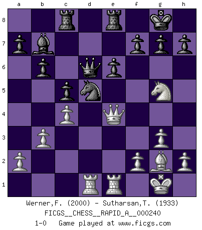 Last move : 1-0 2019 July 20 23:55:41 [Event "FICGS__CHESS__RAPID_A__000240"] [Site "FICGS"] [Date "2019.05.23"] [Round "1"] [White "Werner,Frank-Karl"] [Black "Sutharsan,Thirunathan"] [Result "1-0"] [WhiteElo "2000"] [BlackElo "1933"] 1.c4 e6 2.Nf3 Nf6 3.d4 d5 4.g3 Be7 5.Bg2 c6 6.b3 O-O 7.O-O b6 8.Bb2 Ba6 9.Nbd2 Nbd7 10.Qb1 Rc8 11.e4 Nxe4 12.Nxe4 dxe4 13.Qxe4 Nf6 14.Qe2 c5 15.Rad1 Qc7 16.Rfe1 Rfe8 17.d5 Nxd5 18.Be5 Bd6 19.Bxd6 Qxd6 20.Qe4 Bb7 21.Ng5 1-0 This chess game has been lost on time (started : 2019.05.23 16:30:49) English Opening Kingside Castling by player Black (move 6) Kingside Castling by player White (move 7) Player White won this chess game. Follow this game move after move (download)All I want to do, ever, is just play Chess. (Bobby Fischer) Es ist wirklich schade, dass so viele Schachspieler nicht auf ihr Äußeres achten! (Alexandra Kosteniuk) ¿Quién es tu oponente esta tarde? Esta tarde mi oponente son las piezas negras. (Akiba Rubinstein) On a dit que l'homme se distingue de l'animal par le fait qu'il achète plus de livres qu'il ne peut en lire. Je voudrais suggérer qu'inclure à la liste des livres quelques livres d'échecs rendrait la distinction manifeste. (Edward Lasker) To steal ideas from one person is plagiarism. To steal from many is research. (Unknown)