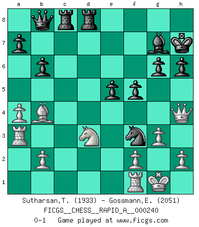 Last move : 0-1 2019 June 20 8:28:51 [Event "FICGS__CHESS__RAPID_A__000240"] [Site "FICGS"] [Date "2019.05.23"] [Round "1"] [White "Sutharsan,Thirunathan"] [Black "Gossmann,Ewald"] [Result "0-1"] [WhiteElo "1933"] [BlackElo "2051"] 1.d4 Nf6 2.c4 g6 3.Nc3 d5 4.Nf3 Bg7 5.cxd5 Nxd5 6.g3 c5 7.Bg2 Nc6 8.O-O cxd4 9.Nxd5 Qxd5 10.Ng5 Qb5 11.a4 Qb6 12.Ra3 h6 13.Rb3 Qc7 14.Ne4 O-O 15.Qc2 Bf5 16.Bd2 Rac8 17.Qc1 Qb8 18.Nc5 b6 19.Qe1 Qd6 20.Nd3 e5 21.e3 dxe3 22.Qxe3 Rfd8 23.Be4 Bxe4 24.Qxe4 f5 25.Qc4+ Kh7 26.Bb4 Qb8 27.Qh4 Nd4 28.Ra3 Nf3+ 0-1 King's Indian defense, 3.Nc3 Kingside Castling by player White (move 8) Kingside Castling by player Black (move 14) Player Black won this chess game. Follow this game move after move (download)The laws of Chess do not permit a free choice: you have to move whether you like it or not. (Emanuel Lasker) Schach ist Krieg, im Schach geht es um testosterongesteuerte Urschreie. (Garry Kasparov) No puedes jugar al Ajedrez si eres de corazón noble. (Proverbio Francés) Je ne suis pas le dernier à jouer lâchement des coups douteux pendant le zeïtnot de l'adversaire pour l'achever: en effet les coups qui font le plus peur sont ceux que l'on ne comprend pas. Je me fais souvent peur quand je joue. (Un professeur anonyme) As a goal marker shodan is important. As a destination it is a poor place to stop. (Thomas Tamayo)