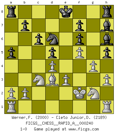 Last move : 1-0 2019 June 5 13:17:28 [Event "FICGS__CHESS__RAPID_A__000240"] [Site "FICGS"] [Date "2019.05.23"] [Round "1"] [White "Werner,Frank-Karl"] [Black "Cleto Junior,Dirceu"] [Result "1-0"] [WhiteElo "2000"] [BlackElo "2189"] 1.d4 d5 2.c4 e6 3.Nc3 Nf6 4.cxd5 exd5 5.Bg5 c6 6.e3 Bf5 7.Qf3 Bg6 8.Bxf6 Qxf6 9.Qxf6 gxf6 10.Nf3 Nd7 11.Nh4 Nb6 12.f4 h5 13.Kf2 Nc8 14.f5 Bh7 15.h3 Nd6 16.Bd3 Bh6 17.g4 a5 18.Ng2 1-0 QGD : Exchange, positional line, 5...c6 Player White won this chess game. Follow this game move after move (download)Chess is mental torture. (Garry Kasparov) Pläne sind die Träume des Verständigen. (Ernst Freiherr von Feuchtersleben) Todavía soy una víctima del Ajedrez. Tiene toda la belleza del arte y mucho mas. No puede ser comercializado. El Ajedrez es mas puro que el arte en su posición social. (Marcel Duchamp) Aux échecs, les retours au sommet sont rares : les dommages psychologiques consécutifs à une défaite sont trop sévères. (Daily Telegraph) The problem with troubleshooting is that trouble shoots back. (Anonymous)