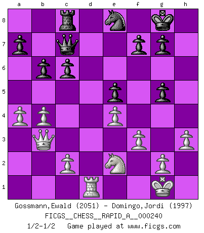 Last move : 1/2-1/2 2019 July 2 23:18:1 [Event "FICGS__CHESS__RAPID_A__000240"] [Site "FICGS"] [Date "2019.05.23"] [Round "1"] [White "Gossmann,Ewald"] [Black "Domingo,Jordi"] [Result "1/2-1/2"] [WhiteElo "2051"] [BlackElo "1997"] 1.e4 e5 2.Nf3 d6 3.d4 exd4 4.Qxd4 Nc6 5.Bb5 Bd7 6.Qd3 Nf6 7.Nc3 Be7 8.O-O O-O 9.h3 Ne5 10.Nxe5 dxe5 11.Bxd7 Qxd7 12.Qc4 c6 13.Rd1 Qc7 14.Be3 Rfd8 15.a4 Ne8 16.b4 b6 17.Qb3 h6 18.f3 Rac8 19.Rxd8 Bxd8 20.Ne2 Bg5 21.Bxg5 hxg5 22.Rd1 1/2-1/2 Philidor : Exchange variation Kingside Castling by player White (move 8) Kingside Castling by player Black (move 8) This chess game ended in a draw. Follow this game move after move (download)An attack on the wing should be met by play in the center. (Nimzovitch) Ich bewundere Kasparows phantasievolle Angriffssiege aus den Achtzigern und Neunzigern, aber wenn man sie mit dem Computer überprüft, nimmt der Computer in jeder zweiten Partie die Opfer an, verteidigt sich und gewinnt. (Vladimir Kramnik) Un entendimiento a fondo de las continuaciones típicas del mate, hace de las combinaciones de sacrificio mas complicadas conducirlas a ellas no solo sin dificultad, sino casi de una manera natural. (Siegbert Tarrasch) Un journaliste : 'Vous préférez avoir une dame de plus sur l'échiquier ou au lit ?' Boris Spassky : 'Ca dépend de la position.' All the biggest technological inventions created by man - the airplane, the automobile, the computer - says little about his intelligence, but speaks volumes about his laziness. (Mark Kennedy)