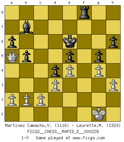 Last move : 1-0 2019 June 27 18:35:5 [Event "FICGS__CHESS__RAPID_E__000228"] [Site "FICGS"] [Date "2019.05.24"] [Round "1"] [White "Martinez Camacho,Victor Hugo"] [Black "Leurette,Marc-Antoine"] [Result "1-0"] [WhiteElo "1116"] [BlackElo "1324"] 1.e4 e5 2.Nf3 Nc6 3.Bb5 a6 4.Ba4 b5 5.Bb3 Nf6 6.O-O Bd6 7.Ng5 O-O 8.d3 Be7 9.Nc3 Nd4 10.Be3 c5 11.Bxf7+ Rxf7 12.Nxf7 Kxf7 13.Bxd4 cxd4 14.Nd5 Bb7 15.Nxe7 Qxe7 16.f4 d6 17.fxe5 dxe5 18.g4 h6 19.Rf3 Qe6 20.h3 g5 21.Qe2 Rh8 22.Raf1 Rf8 23.Rxf6+ Qxf6 24.Rxf6+ Kxf6 25.Qd2 Ke6 26.Qa5 1-0 Ruy Lopez : Caro variation Kingside Castling by player White (move 6) Kingside Castling by player Black (move 7) Player White won this chess game. Follow this game move after move (download)Only the player with the initiative has the right to attack. (Wilhelm Steinitz) Mit sehr nachdenklichem Gesicht schreitet Bobby durch den Turniersaal. Was ist passiert?, fragt Lombardy. Ich stehe schlecht, antwortet Fischer. Lombardy: Dann biete doch einfach Remis an. Fischer: So schlecht stehe ich nun auch wieder nicht! (Robert James Fischer) Cuando le juegas a Fischer, no es una cuestion de si vas a ganar o perder. Es una cuestion de si vas a sobrevivir. (Boris Spassky) Toutes choses étant égales, c'est la conviction qui gagne. Alliée à une volonté de vaincre, elle sert de détonateur, suscite des idées, disperse les doutes et aide à penser clairement. (Robert Fischer) The Internet is the world's largest library. It's just that all the books are on the floor. (John Allen Paulos)