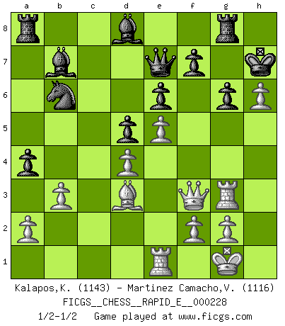 Last move : 1/2-1/2 2019 July 9 0:1:5 [Event "FICGS__CHESS__RAPID_E__000228"] [Site "FICGS"] [Date "2019.05.24"] [Round "1"] [White "Kalapos,Karol"] [Black "Martinez Camacho,Victor Hugo"] [Result "1/2-1/2"] [WhiteElo "1143"] [BlackElo "1116"] 1.d4 Nf6 2.c4 e6 3.Nc3 d5 4.e3 dxc4 5.Bxc4 c6 6.Nf3 b5 7.Bd3 Bb7 8.O-O Bd6 9.Re1 O-O 10.e4 Bc7 11.Qc2 Nbd7 12.e5 Nd5 13.Nxd5 cxd5 14.Bxh7+ Kh8 15.Bd3 a6 16.Qe2 Nb6 17.Ng5 g6 18.Qg4 Kg7 19.h4 Qe7 20.h5 Bd8 21.h6+ Kh8 22.Re3 Qxg5 23.Qe2 Kh7 24.Rh3 Qe7 25.Qg4 Nc4 26.Rg3 Rg8 27.b3 Nb6 28.Bg5 Qxg5 29.Qf3 Qe7 30.Re1 a5 31.Bxb5 a4 32.Bd3 1/2-1/2 Queen's pawn game Kingside Castling by player White (move 8) Kingside Castling by player Black (move 9) This chess game ended in a draw. Follow this game move after move (download)He who takes the Queen's Knight's Pawn will sleep in the streets. (Anonymous) Das ganze Leben mit einer Ehefrau ist wie ein Endspiel mit ungleichfarbigen Läufern. (Viktor Kortschnoi) Dios mío, Bobby Fischer juega tan simple. (Alexei Suetin) Il (Jacob Murray) ne joue pas pour le bon coup, mais pour le meilleur. (Eloi Relange) Men never do evil so completely and cheerfully as when they do it from religious conviction. (Blaise Pascal)