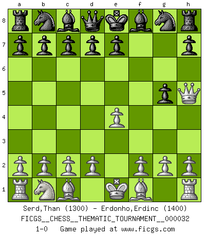 Last move : 1-0 2007 August 1 13:46:17 [Event "FICGS__CHESS__THEMATIC_TOURNAMENT__000032"] [Site "FICGS"] [Date "2007.06.12"] [Round "1"] [White "Serd,Than"] [Black "Erdonho,Erdinc"] [Result "1-0"] [WhiteElo "1300"] [BlackElo "1400"] 1.Nf3 g5 2.Nxg5 f6 3.e4 fxg5 4.Qh5+ 1-0 This chess game has been lost on time (started : 2007.06.12 1:30:29) Reti : Herrstroem gambit Player White won this chess game. Follow this game move after move (download)Chess is played with the mind and not with the hands ! (Renaud and Kahn) Mein Name ist Rustam Kamsky. Sie haben meinen Sohn belästigt. Bereiten Sie sich aufs Sterben vor. (Rustam Kamsky) Realmente no sabemos como el juego fue inventado, aunque hay sospechas. Tan pronto como descubramos a los culpables, se los haremos saber. (Bruce Pandolfini) Des points faibles ou des trous dans la position de l'adversaire doivent être occupés par des pièces et non pas par des pions. (Siegbert Tarrasch) As the days dwindle down... to a precious few. (Maxwell Anderson)