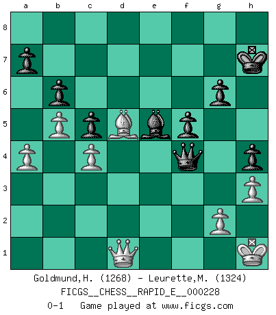 Last move : 0-1 2019 August 1 8:39:49 [Event "FICGS__CHESS__RAPID_E__000228"] [Site "FICGS"] [Date "2019.05.24"] [Round "1"] [White "Goldmund,Heike"] [Black "Leurette,Marc-Antoine"] [Result "0-1"] [WhiteElo "1268"] [BlackElo "1324"] 1.b4 e5 2.Bb2 Nc6 3.b5 Na5 4.Bxe5 d6 5.Bb2 Nf6 6.e3 b6 7.Nf3 Bb7 8.Be2 c5 9.c4 g6 10.O-O Bg7 11.Qc2 O-O 12.d3 d5 13.Nbd2 dxc4 14.Nxc4 Nxc4 15.dxc4 Qc7 16.Be5 Qe7 17.Rfd1 Rad8 18.h3 Bxf3 19.Bxf6 Qxf6 20.Bxf3 Rxd1+ 21.Rxd1 Re8 22.Rd7 Re7 23.Rxe7 Qxe7 24.Bc6 f5 25.Qd3 h5 26.Qd5+ Kh7 27.Bd7 Qf6 28.Qd1 Qb2 29.a4 Qc3 30.Be6 Be5 31.Bd5 h4 32.f4 Qxe3+ 33.Kh1 Qxf4 0-1 This chess game has been lost on time (started : 2019.05.24 23:59:10) Polish (Sokolsky) opening Kingside Castling by player White (move 10) Kingside Castling by player Black (move 11) Player Black won this chess game. Follow this game move after move (download)Chess is a beautiful mistress. (Bent Larsen) Woher wissen wir, daß der Neanderthaler Blindschach gespielt hat? -- Bei Ausgrabungen wurden keine Schachbretter und Figuren gefunden. (Anonymous) Nunca nadie ha ganado una partida de Ajedrez rindiendose. (Unknown) Mon pion favori sur ma case favorite ! Bronstein en parlant d'un coup de pion en h5 quand il avait les Noirs. God, you are such an idiot. - Actually, I thought I was more of a jerk. (Gregory House to Stacy Warner, House M.D.)