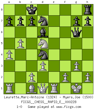 Last move : 1-0 2019 July 17 6:32:46 [Event "FICGS__CHESS__RAPID_E__000228"] [Site "FICGS"] [Date "2019.05.24"] [Round "1"] [White "Leurette,Marc-Antoine"] [Black "Myers,Joe"] [Result "1-0"] [WhiteElo "1324"] [BlackElo "1500"] 1.e4 e5 2.Nf3 Nf6 3.Nc3 Nc6 4.Bc4 d6 5.d3 Be6 6.Bxe6 fxe6 7.O-O Be7 8.a3 Qd7 9.b4 O-O-O 10.b5 Nd4 11.a4 d5 12.Nxe5 Qd6 13.Nf7 Qe5 14.Nxh8 Rxh8 15.Bb2 Bd6 16.exd5 exd5 17.g3 Nd7 18.Re1 Qg5 19.Bc1 Qg6 20.Nxd5 1-0 This chess game has been lost on time (started : 2019.05.24 23:59:10) Petrov Three knights game Kingside Castling by player White (move 7) Queenside Castling by player Black (move 9) Player White won this chess game. Follow this game move after move (download)Excellence at Chess is one mark of a scheming mind. (Sir Arthur Conan Doyle) Jeder Fehler erscheint unglaublich dumm, wenn andre ihn begehen. (Georg Christoph Lichtenberg) Un mal día en el Ajedrez, es mejor que cualquier buen día en el trabajo. (Anonymous) Les échecs sont utiles à l'exercice de la faculté de penser et à celle de l'imagination. Car nous devons posséder une méthode élaborée pour atteindre des buts partout où nous devons conduire notre raison. (Leibnitz) There is a very easy way to return from a casino with a small fortune : go there with a large one. (Jack Yelton)