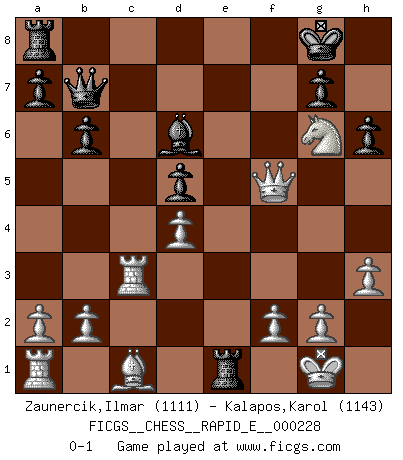 Last move : 0-1 2019 May 29 23:42:40 [Event "FICGS__CHESS__RAPID_E__000228"] [Site "FICGS"] [Date "2019.05.24"] [Round "1"] [White "Zaunercik,Ilmar"] [Black "Kalapos,Karol"] [Result "0-1"] [WhiteElo "1111"] [BlackElo "1143"] 1.e4 c5 2.Nf3 d6 3.c3 Nf6 4.d3 Nc6 5.Be2 e6 6.O-O Be7 7.Nbd2 b6 8.Re1 O-O 9.Nf1 Bb7 10.Ng3 Re8 11.h3 h6 12.Bf1 Bf8 13.d4 Na5 14.e5 dxe5 15.Nxe5 Qc7 16.Nh5 Nxh5 17.Qxh5 cxd4 18.cxd4 Bd5 19.Qg4 f6 20.Ng6 Bb4 21.Re3 Nc4 22.Rg3 Bd6 23.Rc3 Qb7 24.Bxc4 f5 25.Bxd5 exd5 26.Qxf5 Re1+ 0-1 Sicilian Kingside Castling by player White (move 6) Kingside Castling by player Black (move 8) Player Black won this chess game. Follow this game move after move (download)Human affairs are like a Chess game: only those who do not take it seriously can be called good players. (Hung Tzu Ch'eng) Intelligenz läßt sich nicht am Weg, sondern nur am Ergebnis feststellen. (Garry Kasparov) ¡Examina movidas que hagan daño! Un buen ojo for movidas desvastantes es mucho mas importante que el conocimiento de principios estratégicos. (Purdy) Tout change constamment, y compris dans le monde des Echecs. (Botvinnik) What doesn't kill us makes us stronger. (Friedrich Nietzsche)