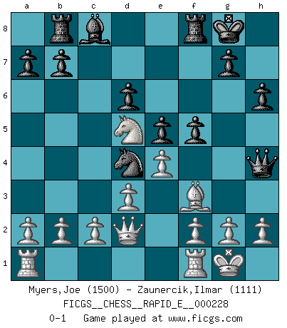 Last move : 0-1 2019 July 13 13:51:34 [Event "FICGS__CHESS__RAPID_E__000228"] [Site "FICGS"] [Date "2019.05.24"] [Round "1"] [White "Myers,Joe"] [Black "Zaunercik,Ilmar"] [Result "0-1"] [WhiteElo "1500"] [BlackElo "1111"] 1.e4 e5 2.Be2 Nf6 3.d3 Bc5 4.Nf3 O-O 5.Bg5 h6 6.Bh4 Nc6 7.Nc3 Bb4 8.O-O Be7 9.Bxf6 Bxf6 10.Nd5 d6 11.Qd2 Bh4 12.Nxh4 Qxh4 13.Nxc7 Rb8 14.Nd5 f5 15.Bf3 Nd4 0-1 This chess game has been lost on time (started : 2019.05.24 23:59:10) King's pawn game Kingside Castling by player Black (move 4) Kingside Castling by player White (move 8) Player Black won this chess game. Follow this game move after move (download)The King is a fighting piece. Use it ! (Wilhelm Steinitz) Ich hatte Zahnschmerzen im ersten Spiel. In der zweiten Partie tat mir der Kopf weh. In der dritten war es eine Rheuma-Attacke und während der vierten fühlte ich mich nicht gut. Und in der fünften? Nun, man muss doch nicht jedes Spiel gewinnen, oder? (Savielly Grigorievitsch Tartakower) Solo el jugador con la iniciativa tiene el derecho a atacar. (Wilhelm Steinitz) Ce qui caractérise les parties de combat, c'est que si le défenseur a constamment de difficiles problèmes à résoudre, l'attaquant doit chercher sans relâche de nouvelles possibilités d'attaque. (Koblentz) Man with more than one clock never knows what time it is. (Chinese thought)