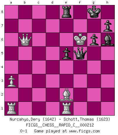 Last move : 0-1 2019 September 15 20:31:48 [Event "FICGS__CHESS__RAPID_C__000212"] [Site "FICGS"] [Date "2019.05.28"] [Round "1"] [White "Nurcahyo,Dery"] [Black "Schott,Thomas"] [Result "0-1"] [WhiteElo "1642"] [BlackElo "1623"] 1.c4 c5 2.Nf3 e5 3.Nc3 Nc6 4.d3 g6 5.a3 a5 6.e3 Bg7 7.Nd5 Nge7 8.Nc3 d5 9.cxd5 Nxd5 10.Ne4 b6 11.Be2 f5 12.Ng3 O-O 13.Qa4 Bd7 14.Qc4 Be6 15.Qa4 Qd6 16.Qh4 Bf6 17.Qh6 Qe7 18.e4 fxe4 19.Nxe4 Bg7 20.Qd2 Nf4 21.O-O Rad8 22.Ne1 c4 23.Qe3 Nd4 24.Bd1 cxd3 25.Nxd3 Nf5 26.Qxb6 Nxd3 27.Nc3 Rb8 28.Qxa5 Nd4 29.Ne4 Qh4 30.f3 Nxc1 31.Rxc1 Rb5 32.Qa6 Rxb2 33.Ng3 Rfb8 34.Re1 Bh6 35.Ra1 Bh3 36.gxh3 Qxh3 37.Be2 Nxf3+ 38.Kf2 Qxh2+ 39.Kxf3 Rf8+ 40.Ke4 Qh4+ 41.Kd5 Qd4+ 42.Ke6 Rb6+ 43.Qxb6 Re8+ 44.Kf6 Qf4+ 45.Nf5 Qxf5+ 0-1 English : Symmetrical variation Kingside Castling by player Black (move 12) Kingside Castling by player White (move 21) Player Black won this chess game. Follow this game move after move (download)The older I grow, the more I value Pawns. (Keres) Alle offensichtlichen Züge sehen nach dem Spiel in der Analyse verdächtig aus. (Viktor Kortschnoi) Existen dos clases de sacrificios: los correctos y los míos. (Mikhail Tal) Le joueur d'Echecs qui veut atteindre le top est obligé de développer son propre credo créatif. Alexeï Stepanovicth Souétine. Il est facile d'écrire des livres ! Ce qui est difficile, c'est de jouer ! (Alexeï Stepanovicth Souétine) Knowledge will give you power, but character respect. (Bruce Lee)