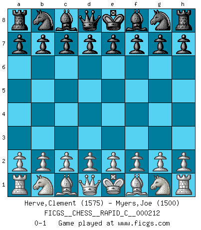 Last move : 0-1 2019 June 27 10:48:49 [Event "FICGS__CHESS__RAPID_C__000212"] [Site "FICGS"] [Date "2019.05.28"] [Round "1"] [White "Herve,Clement"] [Black "Myers,Joe"] [Result "0-1"] [WhiteElo "1575"] [BlackElo "1500"] 0-1 This chess game has been lost on time (started : 2019.05.28 1:30:41) Player Black won this chess game. Follow this game move after move (download)By playing at Chess then, we may learn: First: Foresight... Second: Circumspection... Third: Caution... And lastly, we learn by Chess the habit of not being discouraged by present bad appearances in the state of our affairs, the habit of hoping for a favorable chance, and that of persevering in the secrets of resources. (Benjamin Franklin) Moralische Siege zählen nicht. (Savielly Grigorievitsch Tartakower) Desconfianza es la característica mas necesaria de un jugador de Ajedrez. (Siegbert Tarrasch) Les ravages du H expliquent la différence de niveau entre Tal et Thal [Abergel]. The only thing that matters is the evidence. (Horatio Caine, C.S.I. Miami)