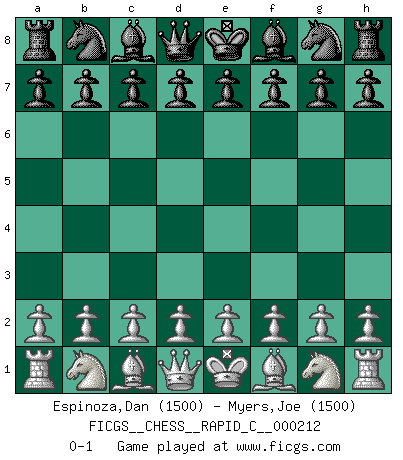 Last move : 0-1 2019 June 27 10:48:49 [Event "FICGS__CHESS__RAPID_C__000212"] [Site "FICGS"] [Date "2019.05.28"] [Round "1"] [White "Espinoza,Dan"] [Black "Myers,Joe"] [Result "0-1"] [WhiteElo "1500"] [BlackElo "1500"] 0-1 This chess game has been lost on time (started : 2019.05.28 1:30:41) Player Black won this chess game. Follow this game move after move (download)I'm not afraid of Spassky. The world knows I'm the best. You don't need a match to prove it. (Bobby Fischer) Fischer: 'Remis!?' Uhlmann: 'Aber es muss doch dreimal Zugwiederholung sein!' Fischer: 'Sie nehmen das Remis an, wie ich es sage, sonst spiele ich weiter und werde Sie dann schlagen!' (Robert James Fischer) Aunque la mayoría de la gente disfruta observar las partidas de los grandes Maestros de ataque, algunos de los jugadores mas notables en la historia han sido los jugadores silenciosos posicionales. Lentamente ellos te aplastan despojandote de tu espacio, congestionando tus piezas y dejandote virtualmente sin nada que hacer. (Yasser Seirawan) Avant la finale, les dieux ont créé le milieu de partie. (Tarrasch) There will be no order, only chaos. (Sol Robeson in Pi by Darren Aronofsky)