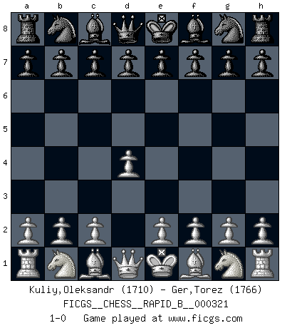 Last move : 1-0 2019 June 27 10:48:49 [Event "FICGS__CHESS__RAPID_B__000321"] [Site "FICGS"] [Date "2019.05.28"] [Round "1"] [White "Kuliy,Oleksandr"] [Black "Ger,Torez"] [Result "1-0"] [WhiteElo "1710"] [BlackElo "1766"] 1.d4 1-0 This chess game has been lost on time (started : 2019.05.28 9:23:39) Queen's pawn Player White won this chess game. Follow this game move after move (download)The stomach is an essential part of the Chess master. (Bent Larsen) Kein Großmeister ist normal. Sie unterscheiden sich nur im Ausmaß Ihrer Verrücktheit. (Viktor Kortschnoi) Un sacrificio se refuta mucho mejor al aceptarlo. (Wilhelm Steinitz) Demandez au pauvre Cg1 ce qu'il en pense. Eduard Gufeld à propos de la variante Saemisch de l'Est-Indienne. Life is verb, not a noun. (Charlotte Perkins Gilman)