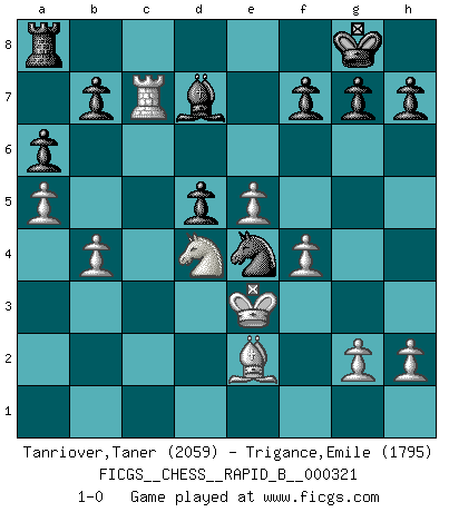 Last move : 1-0 2019 August 24 8:55:15 [Event "FICGS__CHESS__RAPID_B__000321"] [Site "FICGS"] [Date "2019.05.28"] [Round "1"] [White "Tanriover,Taner"] [Black "Trigance,Emile"] [Result "1-0"] [WhiteElo "2059"] [BlackElo "1795"] 1.e4 e6 2.d4 d5 3.Nc3 Nf6 4.e5 Nfd7 5.f4 c5 6.Nf3 Nc6 7.Be3 cxd4 8.Nxd4 Bc5 9.Qd2 Nxd4 10.Bxd4 Bxd4 11.Qxd4 Qb6 12.Nb5 Qxd4 13.Nxd4 a6 14.Be2 Nc5 15.a4 Bd7 16.a5 O-O 17.Rf1 Rfb8 18.Kd2 Ne4+ 19.Ke3 Rc8 20.c4 Nc5 21.Rfc1 Rc7 22.b4 Ne4 23.cxd5 Rxc1 24.Rxc1 exd5 25.Rc7 1-0 French : Steinitz, Boleslavsky variation Kingside Castling by player Black (move 16) Player White won this chess game. Follow this game move after move (download)Pawn endings are to Chess what putting is to golf. (Cecil Purdy) Ich weiss nicht was Gott gegen mich auf 1.e4 antworten würde. (Robert James Fischer) El Ajedrez es despiadado: debes de estar preparado para matar gente. (Nigel Short) Des combinaisons [dans le jeu d'échecs] pareilles à des mélodies. Je crois entendre pour ainsi dire la musique des coups... (Vladimir Nabokov) Lottery : A tax on people who are bad at math. (Author unknown)