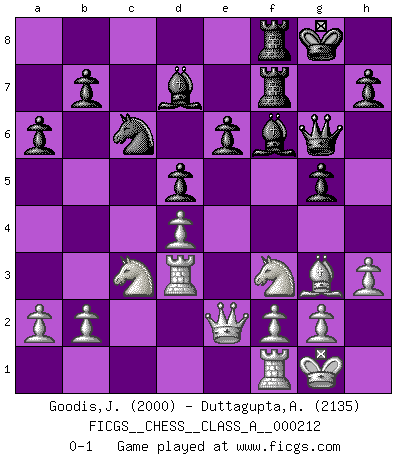 Last move : 0-1 2019 October 30 7:28:42 [Event "FICGS__CHESS__CLASS_A__000212"] [Site "FICGS"] [Date "2019.05.28"] [Round "1"] [White "Goodis,Johannes"] [Black "Duttagupta,Aniruddha"] [Result "0-1"] [WhiteElo "2000"] [BlackElo "2135"] 1.e4 c5 2.c3 Nf6 3.e5 Nd5 4.d4 cxd4 5.Nf3 e6 6.cxd4 d6 7.Bc4 Nc6 8.O-O Be7 9.Qe2 O-O 10.Qe4 Bd7 11.Bd3 f5 12.exf6 Nxf6 13.Qe2 Qa5 14.Nc3 Qh5 15.Bf4 Nd5 16.Bg3 Ndb4 17.Bc4 d5 18.Bb5 a6 19.Bxc6 Nxc6 20.Rfd1 Rf7 21.Rd3 Raf8 22.Rad1 g5 23.h3 Qg6 24.Rf1 Bf6 0-1 Sicilian : Alapin's variation (2.c3) Kingside Castling by player White (move 8) Kingside Castling by player Black (move 9) Player Black won this chess game. Follow this game move after move (download)Adequate compensation for a sacrifice is having a sound combination leading to a winning position; adequate compensation for a blunder is having your opponent snatch defeat from the jaws of victory. (Bruce A. Moon) Kasparov stellt für gewöhnlich die Regeln auf und bricht sie dann selbst wieder. (Alexej Shirov) La captura del Rey enemigo es la finalidad pero no el primer objetivo de la partida. (William Steinitz) Le jeu d'échecs est comme rejeté hors du temps. (Antoine de Saint-Exupéry) If you know the enemy and know yourself you need not fear the results of a hundred battles. (Sun Tzu)
